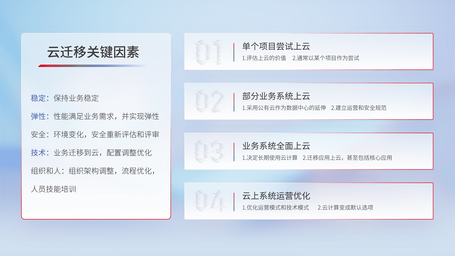 结合实际业务,,,从规划设计、、、、云平台选型、、云原生改造、、数据迁移、、集成交付,,,,迁移全过程为客户识别最佳上云路径,,做好风险识别管理,,设计网络架构、、、身份权限、、、、安全审计合规、、、操作审计、、日志审计、、、、监控告警策略、、、多站点容灾设计等,,,对云上基础设施进行整体规划,,提升IT治理水平,,,以满足弹性、、、、高可用、、、高性能的需求。。。。