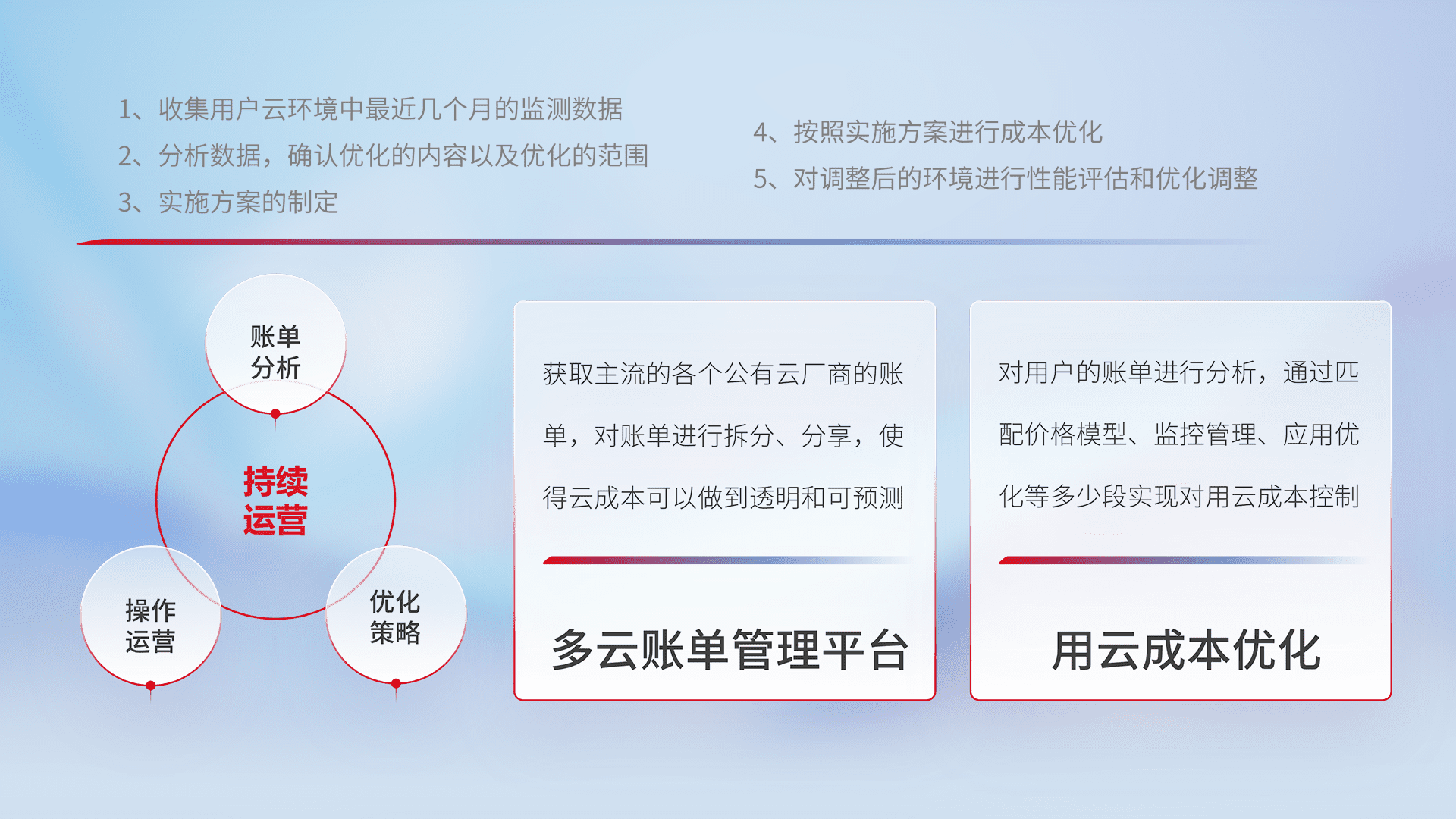 通过多云纳管,,以统一的资源数据模型把客户的云资源进行抽象和封装,,,进而实现对多云资源的统一操作,,保障云资源管理的可靠性、、、、稳定性与可用性。。量身定制化运维内容,,,配置、、开发运维、、、、补丁管理、、备份、、监控、、认证和访问管理、、、、审计和日常巡检等,,,,保障在用云过程中的可靠度,,,,稳定度以及高可用率。。。